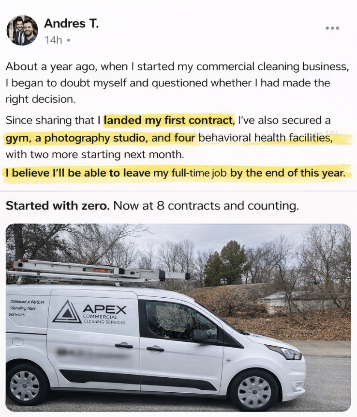 So we went back to cleaning. This time on our own terms. The real unlock was simple: stop chasing small clients and focus on the handful of businesses already paying $3K to $10K per month for cleaning.